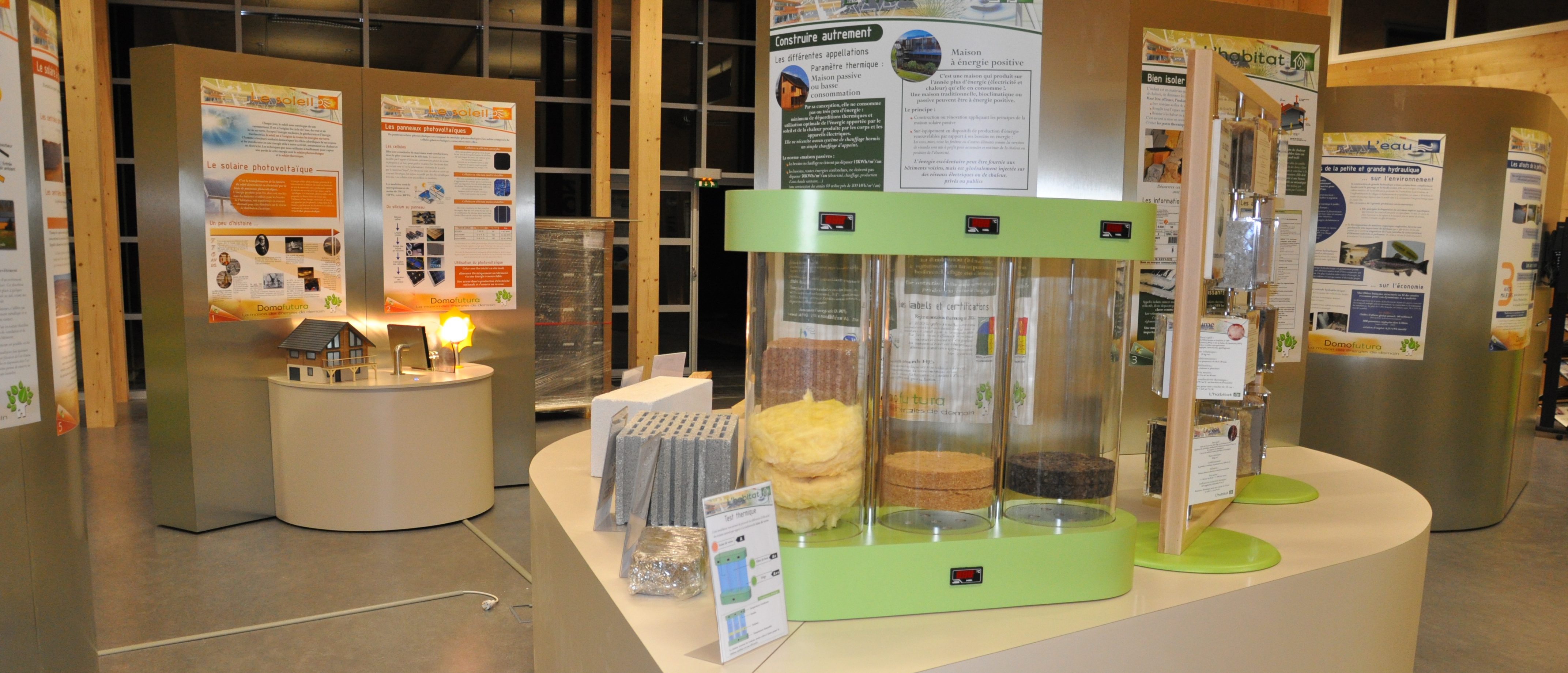 Un jeu, qui permet aux visiteurs de voir, comprendre et toucher les différents matériaux écologiques disponibles dans l’isolation de l’habitat.